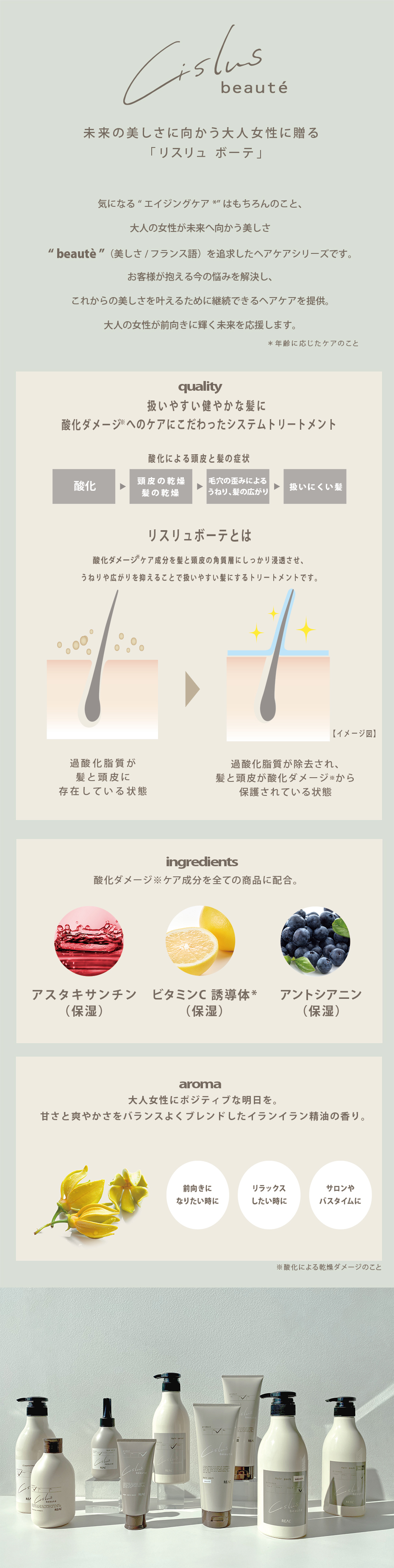 抗氧化同時滋潤頭髮及頭皮,可去除頭皮氧化脂質。溫和潔淨頭皮及頭髮,使頭髮順滑易梳。